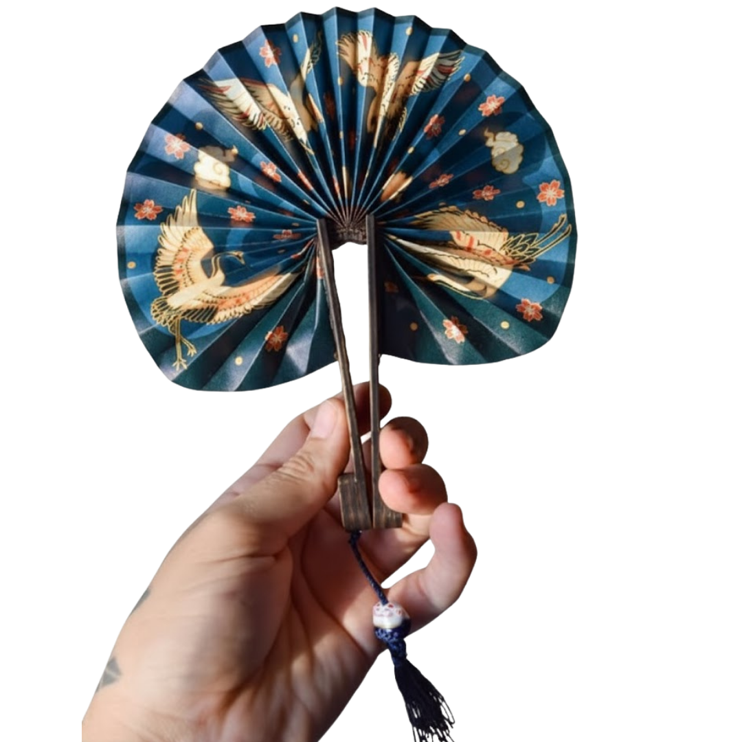 Abanico mini de Tyvek plegado a mano. El Tyvek es un producto que a simple vista parece papel, pero está hecho de fibras de polietileno spunbound de alta densidad. Impreso de ambas caras en tinta UV, es resistente al agua y al sol.
