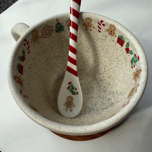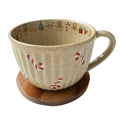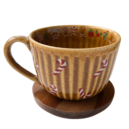 Taza de cerámica jaspeada con motivos navideños. Disponible en 3 colores.